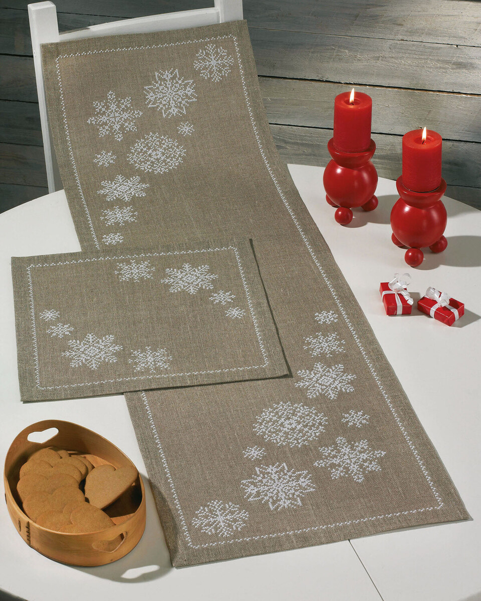 Broderisett Snøfnugg på lin 38 x 122 cm