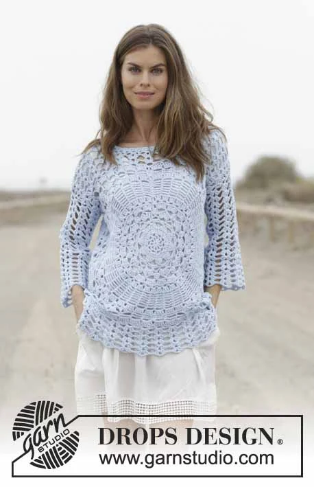 Heklebluse med hullmønster, hekle fra midten og ut. Størrelse S - XXXL. Verket er heklet i DROPS Paris Recycled Denim.