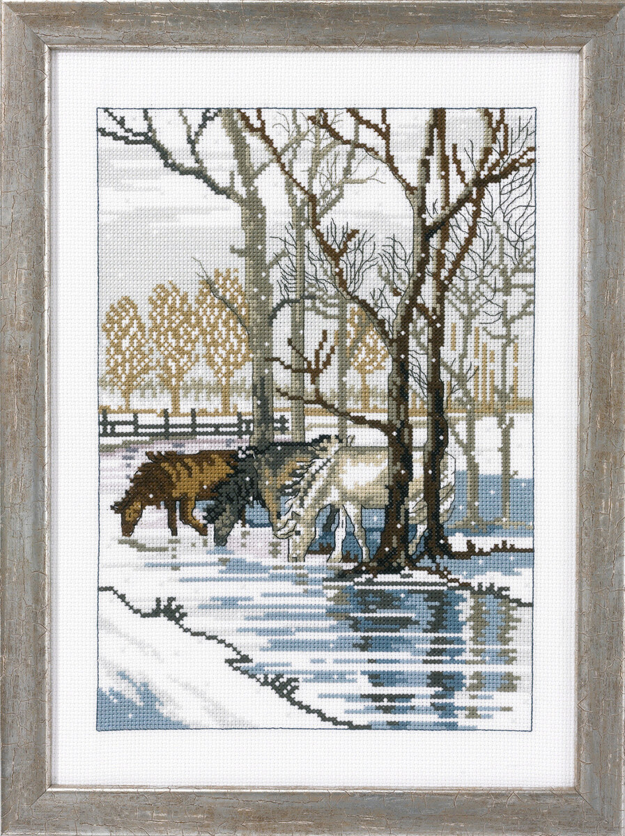 Broderisett 3 hester ved elven 35 x 25 cm R5797