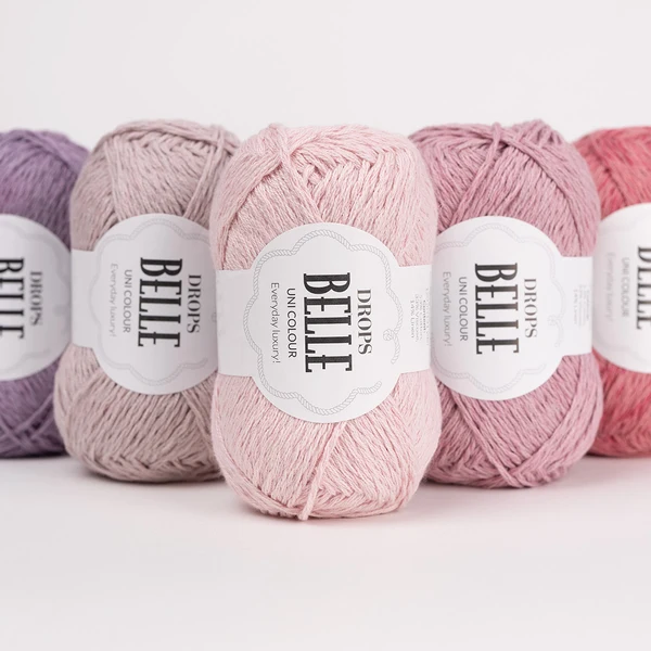 DROPS Belle kan brukes til alt fra lette sommertopper til fine babyartikler. Garnet tilhører Garngruppe B og passer i oppskrifter designet for f.eks. DROPS Cotton Light og Muskat.