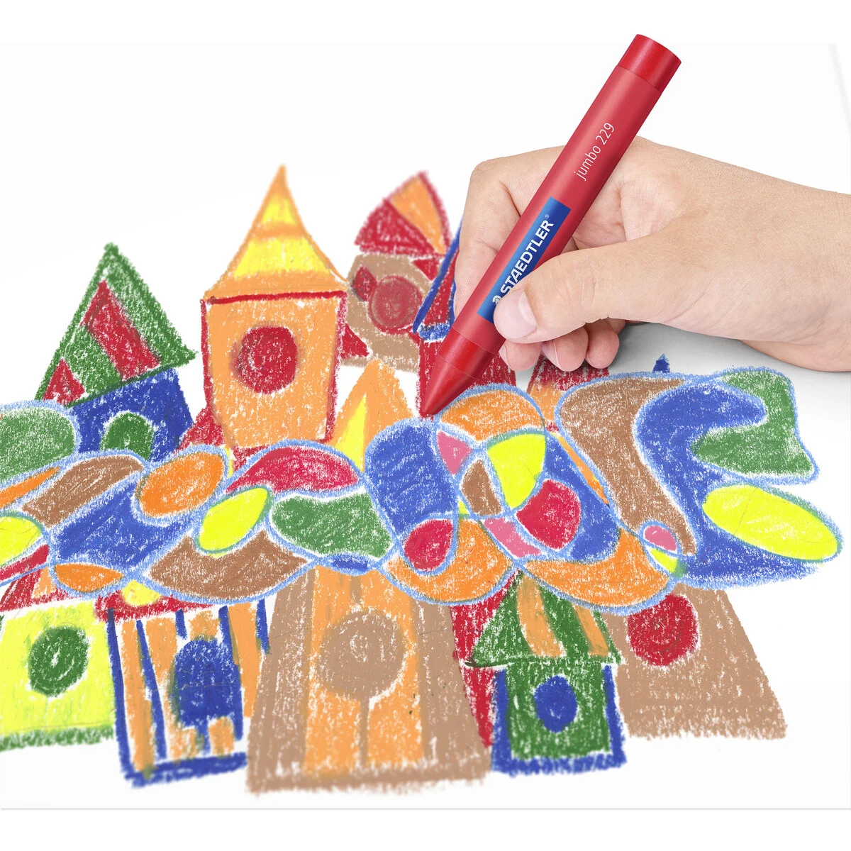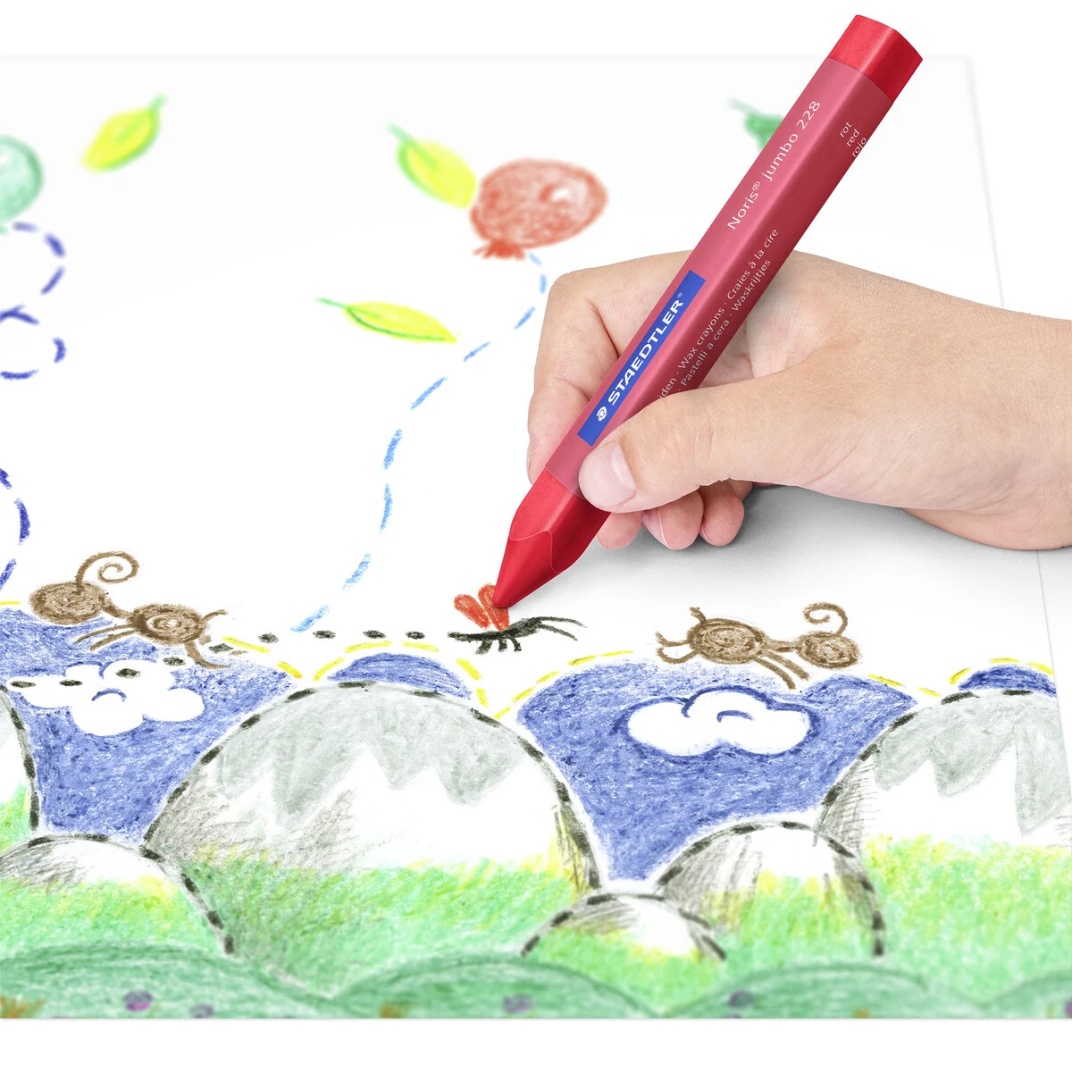 STAEDTLER® Noris Jumbo voksfargestifter er laget for de første kreative stundene, der små hender skal kunne holde godt fast og få fine resultater med en gang. De runde jumbo-stiftene ligger stabilt i hånden og gir en jevn, fargerik strek som gjør det enkelt å fylle større flater. Med strålende farger passer de perfekt til alt fra fri fantasilek til mer veiledede tegneoppgaver. Papirhylsteret bidrar samtidig til å holde fingrene rene og gjør stiftene mer hygieniske å dele.